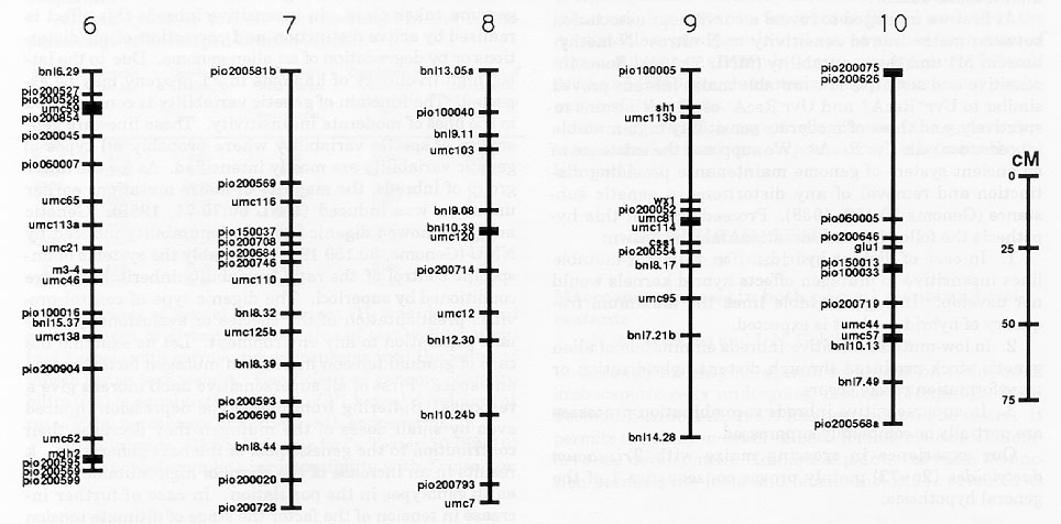 In this report we present a composite map composed of 209 markers and based on data from four F2 populations (B73/Mo17, B73/G35, K05/W65 and J40/v94). Population sizes were 112, 112, 144 and 144 individuals, respectively. The probes used came from Ben Burr (bnl), Univ. of Missouri (umc) and Pioneer Hi-Bred (pio). All molecular biology steps were done using standard conditions. Genetic maps were constructed using MAPMAKER (Lander et al. 1987).