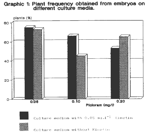 Embryos on medium G formed the largest frequency and the most vigorous plants. Plants obtained on media H, I and L showed very curled leaves.