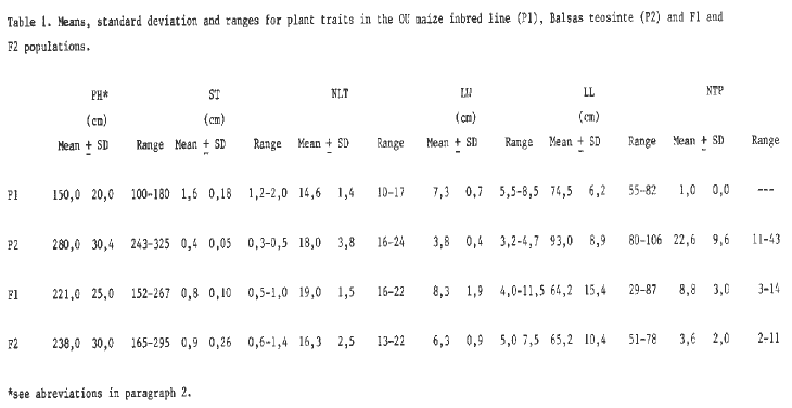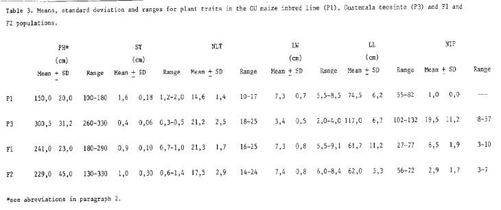 Table 3. Means, standard deviation and ranges for plant traits in the OU maize inbred line (P1), Guatemala teosinte (P3) and F1 and F2 populations.