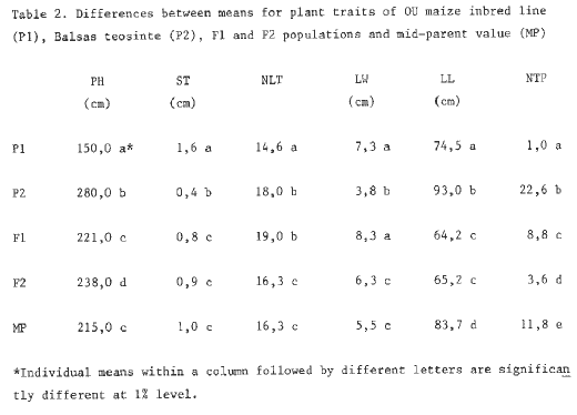 Table 2. Differences between means for plant traits of OU maize inbred line (P1), Balsas teosinte (P2), F1 and F2 populations and mid-parent value (MP).