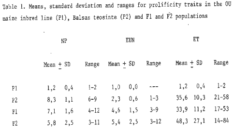 Table 1. Means, standard deviation and ranges for prolificity traits in the OU maize inbred line (P1), Balsas teosinte (P2) and F1 and F2 populations.