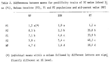 Table 2. Differences between means for prolificity traits of OU maize inbred line (P1), Balsas teosinte (P2), F1 and F2 populations and mid-parent value (MP).