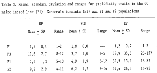 Table 3. Means, standard deviation and ranges for prolificity traits in the OU maize inbred line (P1), Guatemala teosinte (P3) and F1 and F2 populations.