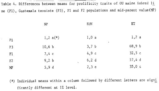 According to the results obtained, it can be stated that prolificity traits are transgressively inherited in a positive direction (heterosis), as happens in diploperennial teosinte-maize hybrids (see MNL 62:77, 1988). It could also be added that maize-Balsas teosinte hybrids seem to be more prolific than those obtained between maize and Guatemala teosinte.