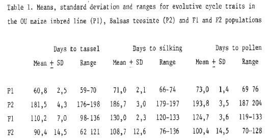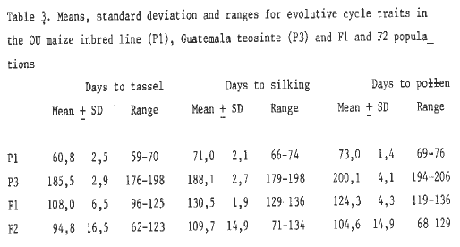 Table 3. Means, standard deviation and ranges for evolutive cylce traits in the OU maize inbred line (P1), Guatemala teosinte (P3) and F1 and F2 populations.