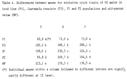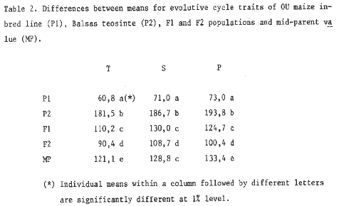 Table 2. Differences betweens means for evolutive cylce traits in the OU maize inbred line (P1), Balsas teosinte (P2), F1 and F2 populations and mid-parent value (MP).