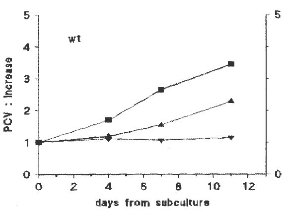 Although nutritional requirements for endosperm cell growth have been described (Shannon, in Sheridan (ed.), Maize for Biological Research, p. 397, 1982), we began experiments on nitrogen requirements for cell division and zein accumulation in A69Y wt and o2 cultures. A medium containing 30 g/l sucrose, 0.4 mg/l thiamine, 200 mg/l inositol and Murashige and Skoog salts (MS-N) was used to grow cells with inorganic nitrogen supply (40 mM NO3-, 20 mM NH4+). Amino acid supplemented media were prepared from MS-N medium by addition of 15 mM asparagine (MS-A) or glutamine (MS-G), proline (MS-P) or asparagine and glutamine (7.5+7.5 mM: MS-AG). Control growth curves were obtained with medium MS-O, with the components of MS-N with the exception of nitrogen salts.