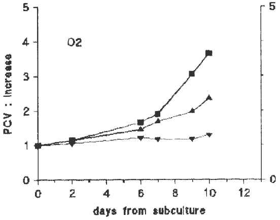 MS-A, MS-G, MS-AG stimulated cell growth rate at the same extent; MS-P was less effective. Zein accumulation was similar in MS-A, MS-G and MS-P; a considerable increase was observed in MS-AG. Asparagine and glutamine, the amino acids supplied to the developing kernels by maize plants (Lyznik et al., Phytochemistry 24:425, 1985) represent a good nitrogen source for wt and o2 cultured cells, as reported for A636 cultures (Lyznik and Tsai, Plant Sci. 63:105, 1989). The ability of cells to grow and accumulate zein in the absence of an organic nitrogen source suggests the capacity of endosperm cells for a consistent amino acid synthesis from inorganic nitrogen; experiments are in progress to elucidate the levels in cultured cells of nitrogen metabolism enzymes, whose levels during endosperm development have been reported with conflicting results (reviewed by Muhitch, Physiol. Plant. 74:176, 1988).