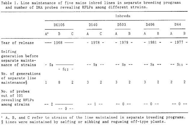 We have analyzed RFLP patterns of different strains of five inbred lines, developed by W. G. Pollmer from the University of Hohenheim (Table 1). The lines have been released between 1968 and 1981. They had been maintained in separate breeding programs in Germany for one to eight generations by selfing or sibbing and rogueing off-type plants.