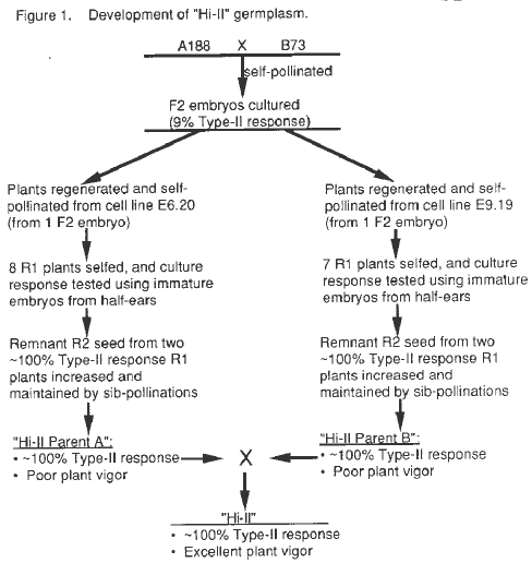 The "Hi-II" germplasm should be useful in any experiments requiring a high-frequency Type-II initiation response from immature embryos or tassels. Many F1 combinations with the "Hi-II" germplasm have formed excellent Type-II cultures, and therefore it should be useful for researchers desiring to produce Type-II cultures of specific dominant or cytoplasmic genetic stocks which are in a recalcitrant background. We feel this material should be particularly useful for researchers with little or no experience with corn tissue culture. It is more "forgiving" than most genotypes, and will respond reasonably well under a wide variety of in vitro culture conditions.