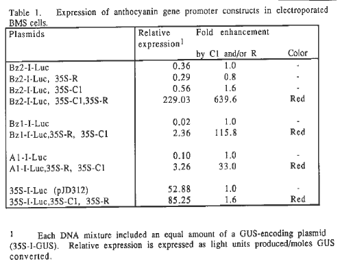 We found that electroporating BMS protoplasts with gene constructs containing components of the maize anthocyanin genes is a simple and efficient technique for studying regulation of this set of genes. We tested promoter activity of a 700 bp upstream region of Bronze-2 using luciferase as a reporter gene, with the first intron from maize Adh1 inserted into the 5' untranslated region (Bz2-I-Luc). Similar constructs with the A1- and Bz1- promoters (A1-I-Luc and Bz1-I-Luc) were obtained from Michael Fromm, while constructs expressing the R and C1 regulatory genes from cDNAs expressed under the control of the CaMV 35S promoter were kindly provided by Susan Wessler and Steven Goff, respectively. As shown in Table 1, following electroporation of protoplasts the Bz2-promoter was activated by R and C1 over 640-fold, while a 33-fold and 150-fold activation of the A1- and Bz1- promoters occurred. No luciferase expression was observed from a construct containing the Bz2-promoter in reversed orientation, either with or without R and C1. Absolute induced levels of luciferase expressed from the Bz2 promoter were approximately twice those of a similar 35S-promoter construct, and approximately 100-fold above induced levels from Bz1- and A1- promoters. Similar results were also obtained using the particle gun to introduce these constructs into intact aleurones of mature seeds (data not shown).