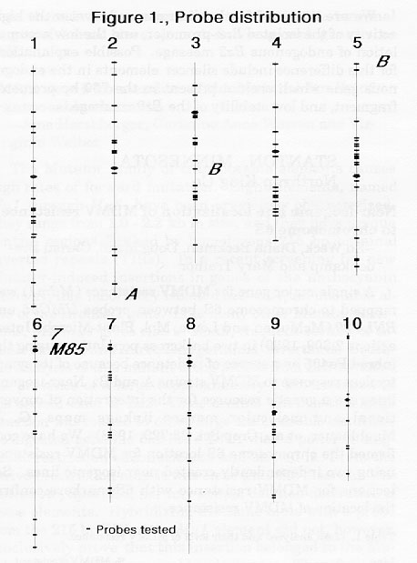 Other regions from Pa405 appeared in the MDMV resistance conversions, NKA-MDM and NKB-MDM. Two probes represented by the letter B, showed an identical banding pattern for NKB-MDM and Pa405 and one probe, represented by the letter A, showed an identical banding pattern for NKA-MDM and Pa405. Letters A and B indi-cate regions of the Pa405 genome that were transferred to MDMV conversions NKB-MDM or NKA-MDM respectively. The additional region in NKA-MDM or the two additional regions in NKB-MDM could result in NKA-MDM being 100% resistant while NKB-MDM is only 66% resistant.