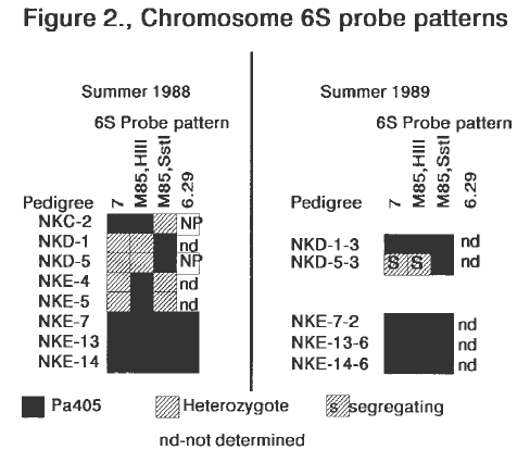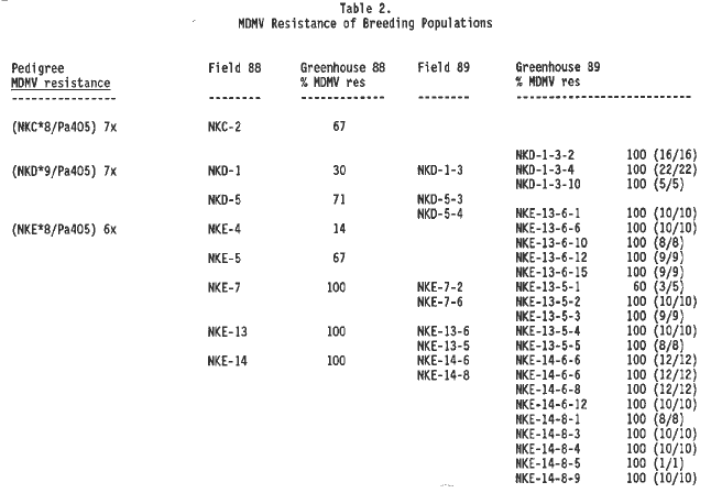 MDMV resistance which had not yielded to breeders attempts to fix the resistance. In the summer of 1988 three lines were planted: (NKC*8/Pa405)7x, (NKD*9/Pa405) 7x and (NKE*8/Pa405) 7x. Table 2 shows the selections planted in the field and greenhouse and the percentage of plants resistant to MDMV. Pollinations from these populations were analyzed for MDMV resistance in the winter of 1988 in the greenhouse. Selections were planted in the summer of 1989, analyzed with chromosome 6S probes, and tested for MDMV resistance in the greenhouse in the winter of 1989. The winter 1989 MDMV viral greenhouse screen showed 99% (204/206) of the individuals to be MDMV resistant following selection with 6S probes NPI7 and UMC85 in the summer of 1989. This indicates that these two 6S probes are strongly correlated with MDMV resistance when using Pa405 as a source.