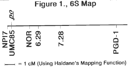 The 6S map in Figure 1 shows the distances between the 6S isozyme and RFLP markers as determined in Mapmaker. In this cross, the Fortran program shows the map position of po to be identical with that of UMC85. Additional crosses will be made in order to integrate ragged, wilted, and piebald leaves into the map.