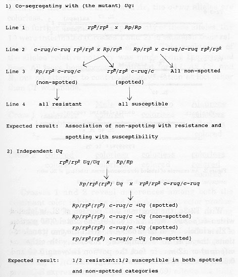 After the mutants are obtained they are verified by a co-segregation test. Two types of mutants are expected as to the status of Uq. One is co-segregating with Uq, i.e., Uq inserted into the Rp gene; the other is with a receptor element controlled by an independent Uq, i.e., Uq is outside the Rp locus. In the Uq insert case, a strategy is used to test co-segregation. Figure 1 shows the strategy and the expected results for the co-segregation test.
