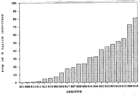 Figure 1. The distribution of Illinois Foundation Seed genotypes based on their production of regenerable callus from immature embryos. The y axis represents the summation of percent callus initiation from the different media.