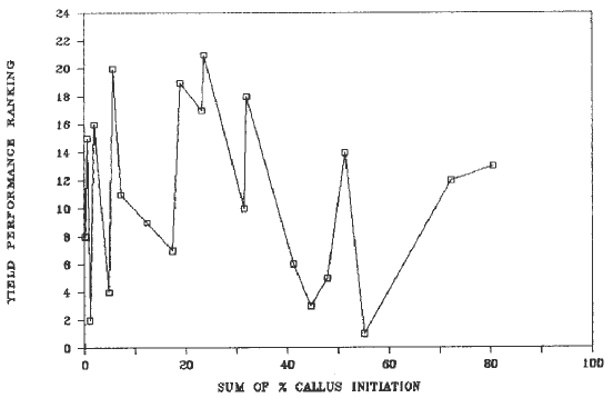 Among the 21 lines tested, from 80% to less than 1% of the embryos cultured formed regenerable callus (Fig. 1). When this percent of callus induced was compared to yield, ear height, root lodging and stalk lodging no correlation could be detected (Fig. 2).