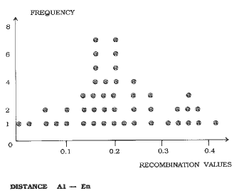 An estimate of A1 - En distance was calculated (direction undetermined), as shown in the figure. This distribution is not random. 60% of the values are in the range of 5 to 20 map units. These results are supportive of Nowick and Peterson (1981), where En transposed preferentially between 5 and 15 map units from A1. Tests for precise location of En are underway.