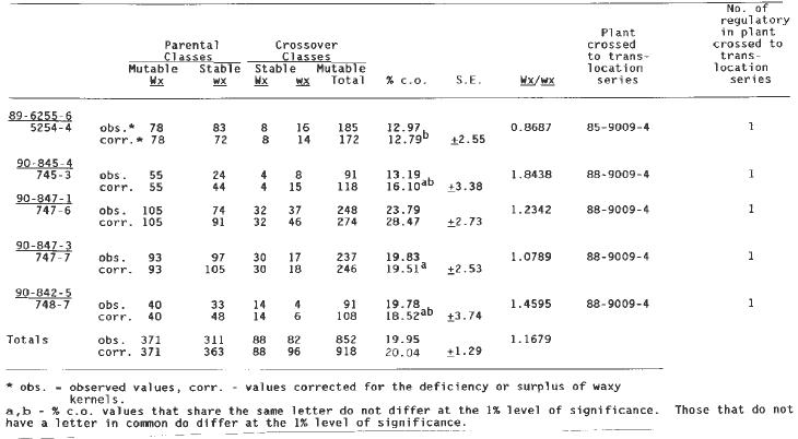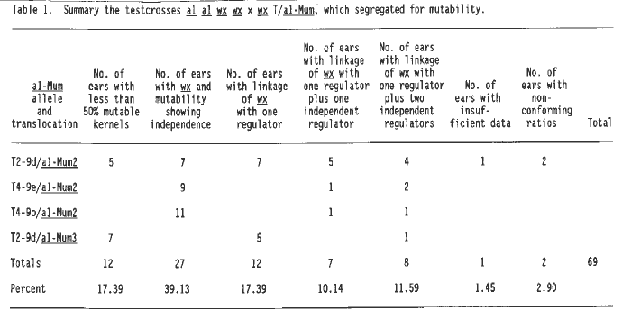 The a1-Mum2 plant crossed to wx T4-9e (89-3001-4, Table 5) was a sibling plant to the one that yielded one of the crosses that had one regulator linked to wx T2-9d (89-3001-9, Table 2), all of the crosses with one regulator linked to wx T2-9d plus an independent regulator (Table 3), and three out of four crosses with one regulator linked to wx T2-9d plus two independent regulators (Table 4). It is conceivable that one of the independent regulators of Table 5 is the regulator linked to wx T2-9d of Tables 2, 3 and 4, although this can not be proved from the existing data.