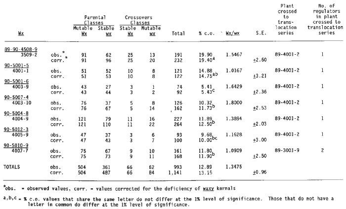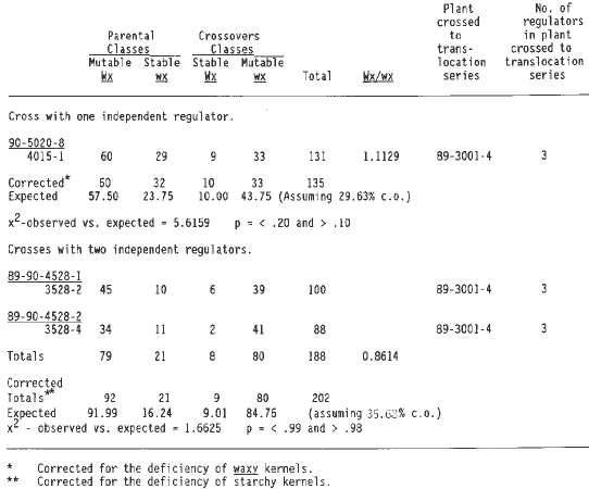 The crosses of a-Mum2 with only one element linked to waxy (Table 2) showed some variation in the amount of crossing over; from a low of 5.43% to a high of 19.40%. There seem to be three levels of recombination (i.e., 5-10%, 10-15%, 15-20%) based on a statistical analysis of the differences between the different recombination values. If these are real differences in recombination, as the statistics indicate, these data would suggest that the regulator has transposed from one location on chromosome two to another. Based on the raw data, the average crossing over for all seven crosses is 12.89%. However, in most crosses there is a deficiency of waxy kernels. The reduced transmission of the wx allele by heterozygous Wx wx plants has been reported in the literature. The �corrected totals� in this and other tables have been calculated by increasing the waxy classes to make them equal to the starchy classes. The added waxy values were distributed among the mutable and stable classes in the same proportion they were observed in the raw data. With this correction in Table 2, the average percentage crossing over is increased from 12.89% to 13.15%. Plants grown from kernels of two different 1:1 ears (i.e., 89-4001-2, 89-3001-9) were crossed to wx T2-9d. The crossover value for the one regulator outcross of 89-3001-9 is very close to some of the crossover values observed for the outcrosses of 89-4001-2. These 1:1 ears may have carried the same regulator at the identical locus as the result of descent from a common progenitor (i.e., the original a1-Mum2 mutation event). Alternatively, their common values may be just coincidental.