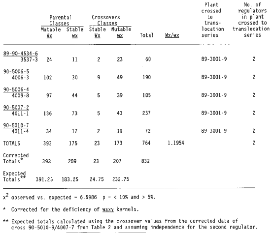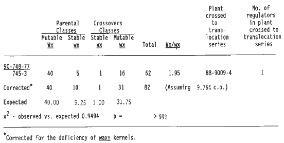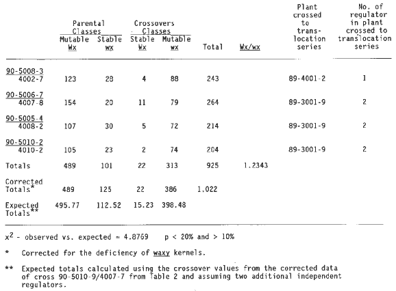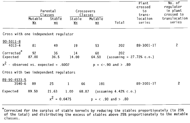 Plant number 89-3001-9 showed evidence of carrying two regulators. The testcross with wx T2-9d (Table 2) indicated the presence of only one regulator. Outcrosses of this same plant to other translocations gave results consistent with the presence of 2 or 3 regulators in different F1's (Tables 3 and 4), thus demonstrating that the number of regulators can either increase or decrease with a single generation of outcrossing.