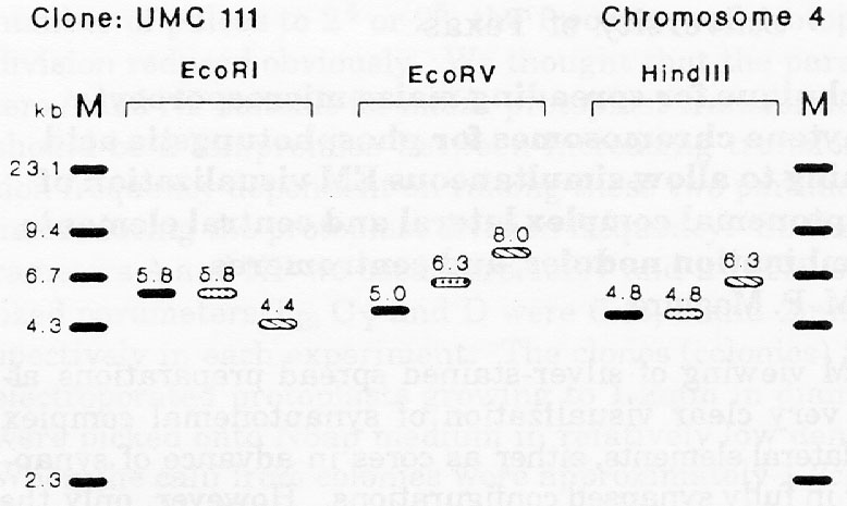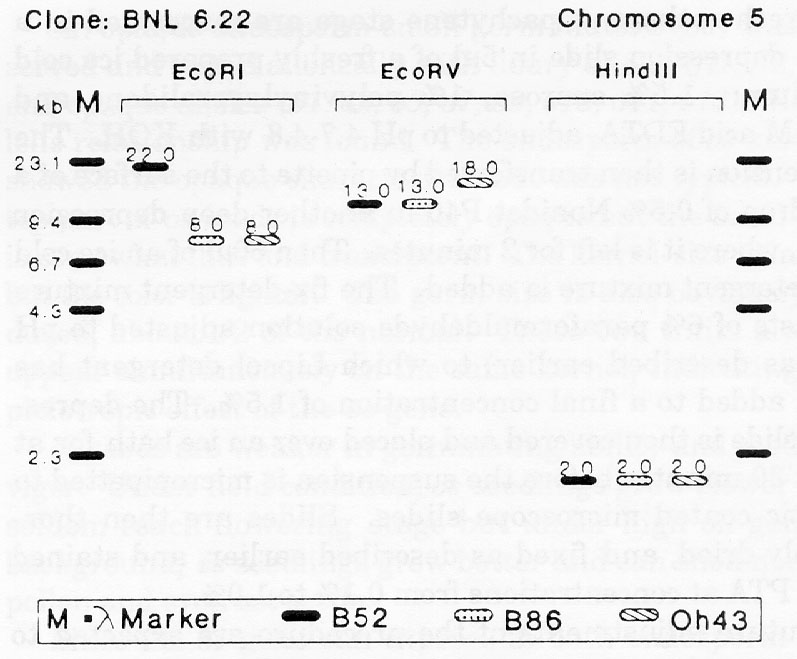 Based on the results of UMC111 with EcoRI and HindIII, B86 very likely inherited this genomic region from B52. The larger fragment of 6.3kb for B86 versus 5.0kb for B52 with EcoRV could be due to a point mutation that eliminated one restriction site for EcoRV in this region. This would agree with the observation of Fähr et al. that all RFLP patterns of B86 found on chromosome arm 4L were identical to those of B52. The RFLP pattern of B86 with UMC111 could also be explained by a crossover event within this region during line development, if B52 and Oh43 reveal class I RFLPs (R. B. Meagher et al., Genetics 120:809-818, 1988) with EcoRI and HindIII (i.e., the polymorphic fragments differ at only one end), but class II RFLP with EcoRV (i.e., the fragments differ at both ends).