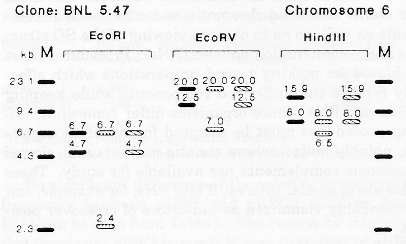 The RFLP pattern of B86 for clone BNL6.22 was identical to Oh43 with EcoRI, but identical to B52 with EcoRV. This indicates a crossover event between the restriction sites of EcoRI and EcoRV in the early generations of line development, assuming class I RFLPs between B52 and Oh43. This matches with the graphical genotype of B86, where the RFLP pattern of the nearest clones, BNL10.06 and UMC67, originated from B52 and Oh43, respectively.
