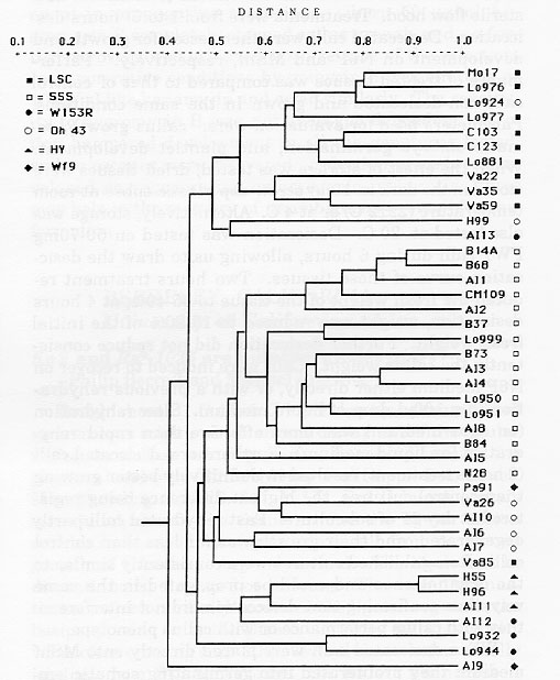 Figure 2. Dendogram revealing associations between lines following cluster analysis of RFLP data. Genetic distance is calculated using Dice similarity coefficient.