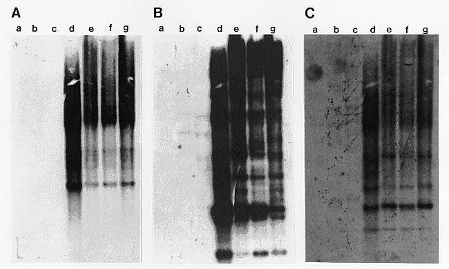 We cloned random TaqI fragments of Tripsacum dactyloides into the AccI site of pUC18 and transformed recombinant plasmids into the E. coli host NM522. Recombinant plasmids were isolated from bacterial cultures, digested with EcoRI and HindIII to liberate the inserts, and Southern blotted onto nylon membranes. Membranes were hybridized consecutively to nick-translated total DNA from Zea and Tripsacum, respectively. A total of three inserts were identified that showed a stronger signal with Tripsacum DNA than with Zea DNA. Subsequent hybridization of these inserts to EcoRI/HindIII-digested DNA from several Zea and Tripsacum species verified the Tripsacum-specificity of the inserts. Figure 1 shows that the inserts from plasmid pTrip9 (Panel A), pTrip25 (Panel B), and pTrip36 (Panel C) hybridize strongly to DNA from Tripsacum species (lanes d-g), but hybridize very little or not at all to Zea DNA (lanes a, b, and c).