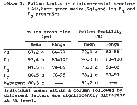 As part of our investigations on diploperennial teosinte-maize hybrids, two pollen grain traits were evaluated in teosinte, maize (Ever Green), and F1 and F2 progenies derived from them. Pollen grain size was evaluated for the main diameter and expressed in microns (µ). Pollen grain fertility was measured considering all those grains completely stained with an I-IK solution and expressed in percent. The results obtained are given in Table 1.