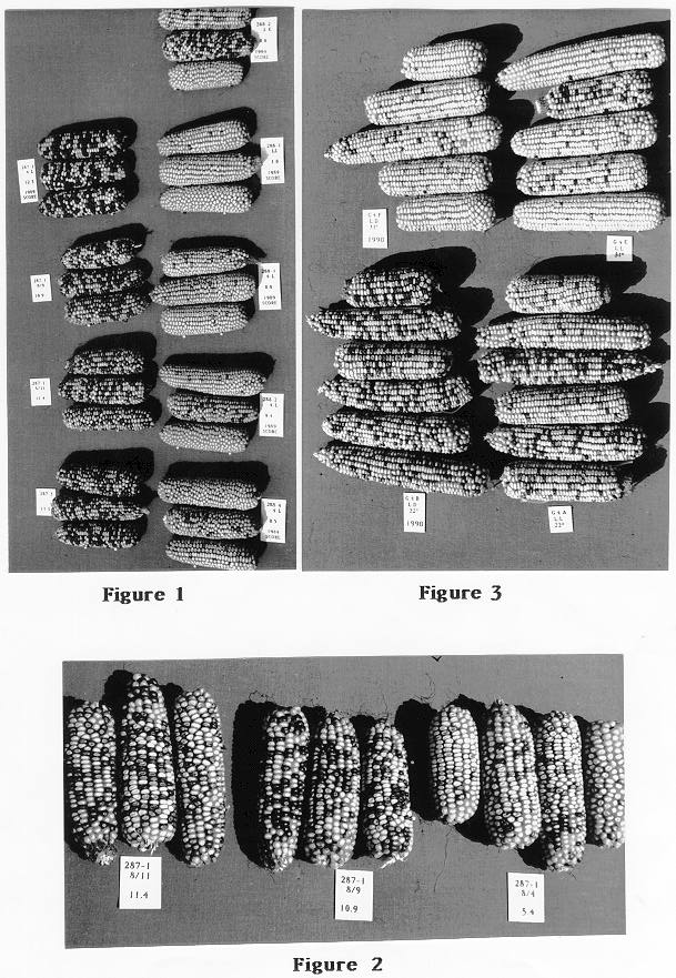 When R R-lst plants are testcrossed over the seven days that pollen is shed, a tassel mosaic for paramutated R-gene expression can be noted. Seeds from each of the seven testcrosses of the previous year were grown out and testcrossed for heritability of the tassel mosaic; differences can still be observed in paramutated R-gene expression (Figure 2). The three ears on the right are from testcrosses from the earliest pollen collection (8/4); the two sets of three ears to the left represent collections made five and seven days later (8/9 and 8/11). Tassel mosaics were more readily observed with the new R-genes from the Southwest than from the more highly inbred R-genes in W22 background which often tend to be "subliminal" and require tedious scoring procedures.