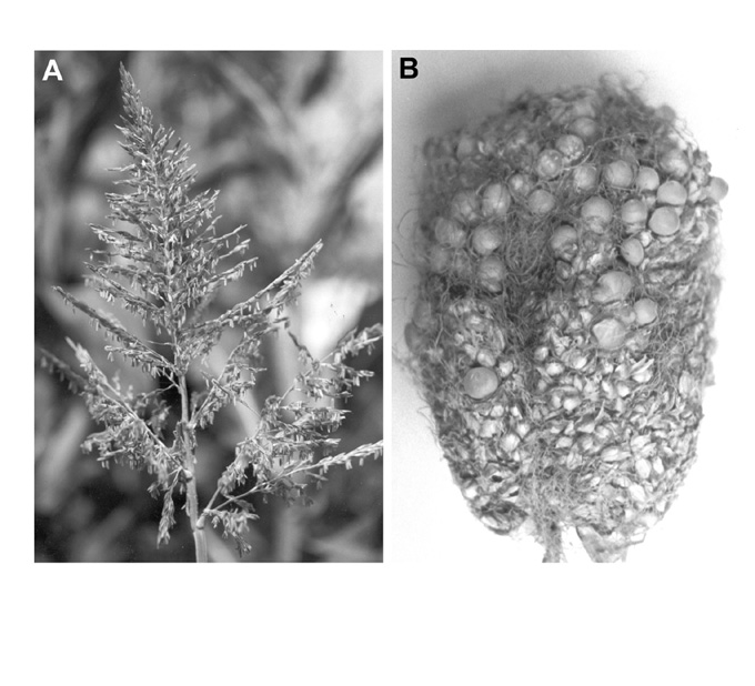 Figure 1. A, ra*-154 tassel at anthesis, showing increased primary branching on the central spike; B, ra*-154 ear at maturity.